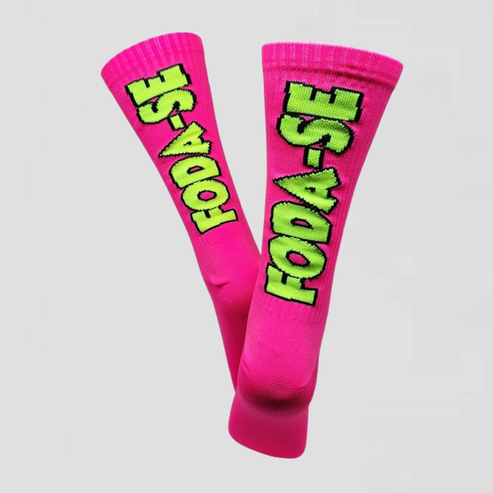As meias do Foda-se , são unissex, seus desenhos são em jacquard, um bordado,